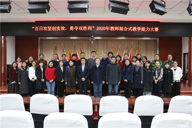 2020年12月29日学院在图书馆四楼多功能厅举办以“百日攻坚创实效、勇夺双胜利为主题的教师混合式教学能力大赛。