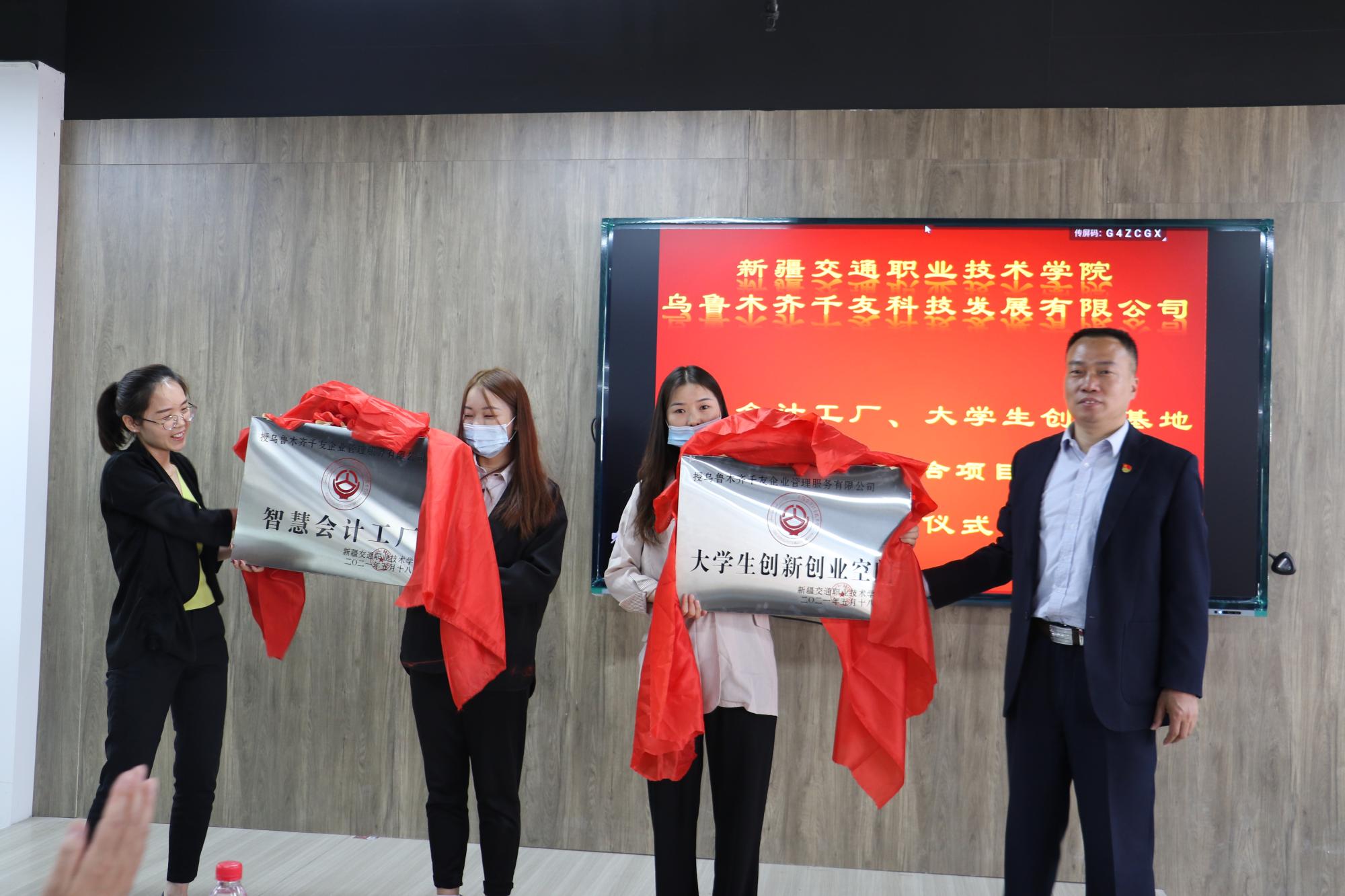 学院党委委员、副院长王宏明和乌鲁木齐千友企业服务管理有限公司法定代表人王宁共同为智慧会计工厂和大学生创客空间揭牌,正式拉开校企深度融合的序幕。