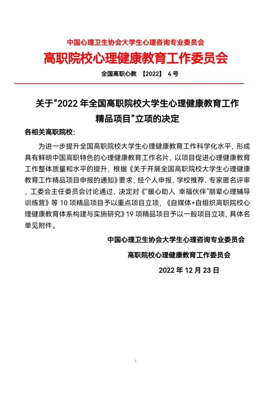 近日,中国心理卫生协会联合高职院校心理健康教育工作委员会举办了2022年全国高职院校大学生心理健康教育学术年会,会上宣布了《2022年全国高职院校大学生心理健康教育工作精品项目立项名单》。由学生工作处心理健康教育与咨询中心主任刘幼群负责,孟宪峰、徐瑾、张之琼、王姗姗老师等主要参与的《构建“一体三心六育”心理育人工作模式》项目申报成功,予以全国重点项目立项。