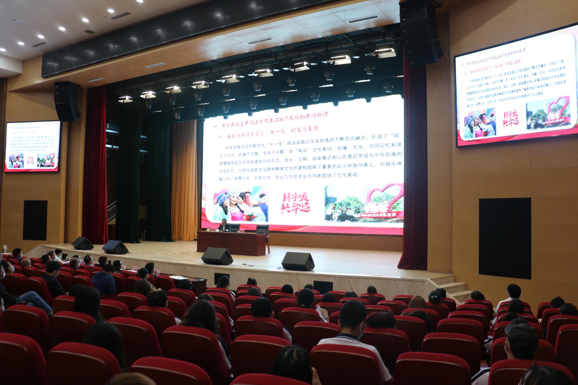 李学东深入浅出,将历史与现代相照应,理论与实践相结合,用一个个感人肺腑的民族团结故事诠释了中华民族是中国这片热土上56个民族的共同称谓,自古以来中华民族就是新疆各民族的集体认同,寄语新疆交通职业技术学院师生要紧扣铸牢中华民族共同体意识主线,立大德、树真人。引导广大师生像爱护自己的眼睛一样爱护民族团结,像珍视自己的生命一样珍视民族团结,像石榴籽那样紧紧抱在一起,铸牢中华民族共同体意识,凝聚全体中华儿女的智慧和力量,携手并肩,为实现中华民族伟大复兴的辉煌目标不懈奋斗。