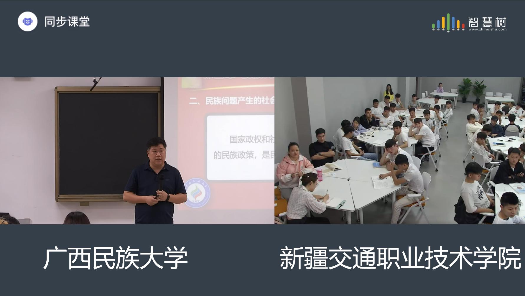 在智慧树平台的支持下,同步课堂分为两部分进行。广西民族大学郭亮老师为学生们讲述了民族问题的概念范畴与内涵特征,他从民族问题产生的根源讲到现实影响,从中国现实讲到世界大势,内容丰富、讲解生动。随后由新疆交通职业技术学院吴冰寒老师讲授,她从历史的角度,通过一个家族的发展变迁,展现了中华民族交往交流交融的过程,与郭亮老师的理论阐释形成共鸣。整节课气氛活跃,两校学生参与积极性高。