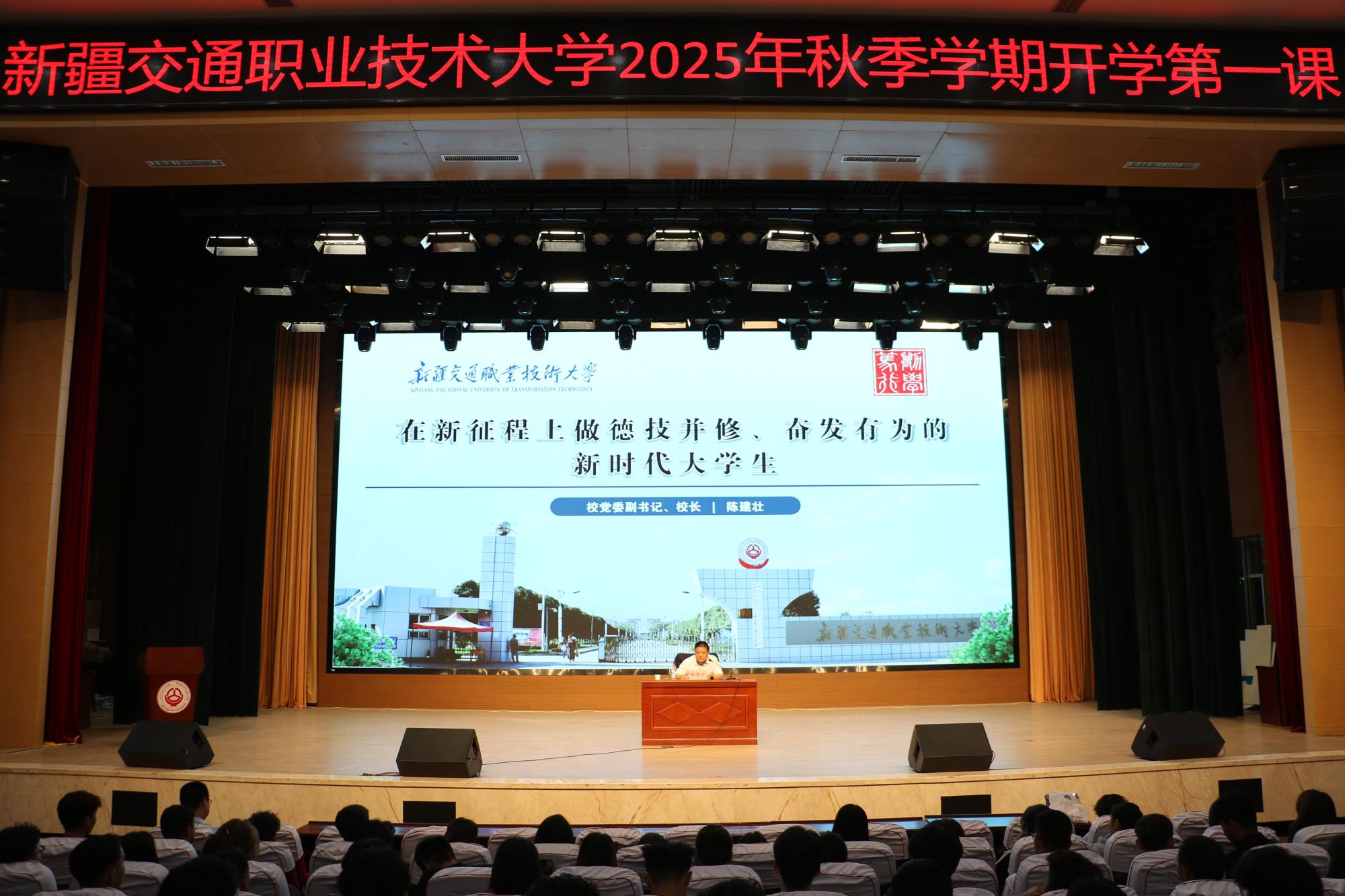 9月9日,Beat365中文官方网站2025年秋季学期“开学第一课”在学校礼堂举行。校长陈建壮以“在新征程上做德技并修、奋发有为的新时代大学生”为题,为全体学生上了生动一课,勉励学生将个人理想融入国家交通事业发展,在天山脚下书写技能报国的青春华章。