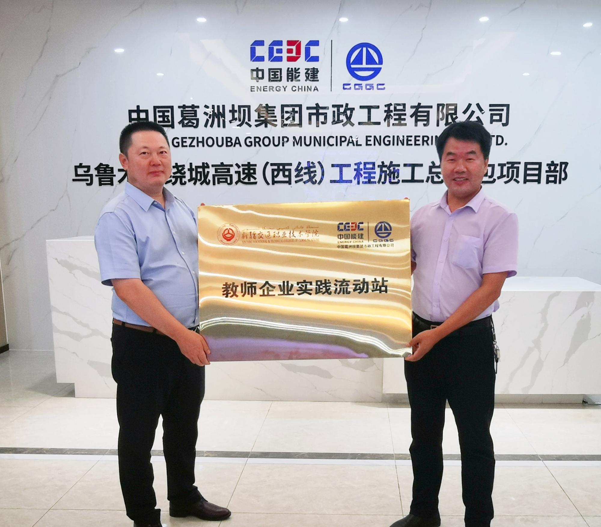 为推进产教融合,深化校企合作,加快学院双师队伍培养,进一步提升教师技术技能水平,8月3日,道路桥梁工程学院院长郭社锋一行5人前往中国葛洲坝集团市政工程有限公司乌鲁木齐绕城高速(西线)工程施工总承包项目部,开展了教师企业实践流动站授牌及学院学生校外智慧化安全实训基地揭牌工作。
