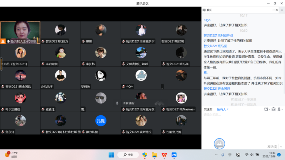 12月16日,学院代菲菲名班主任工作室组织开展了大学生性健康教育系列活动。活动以线上形式开展,智交D221班全体学生参会了本次活动。