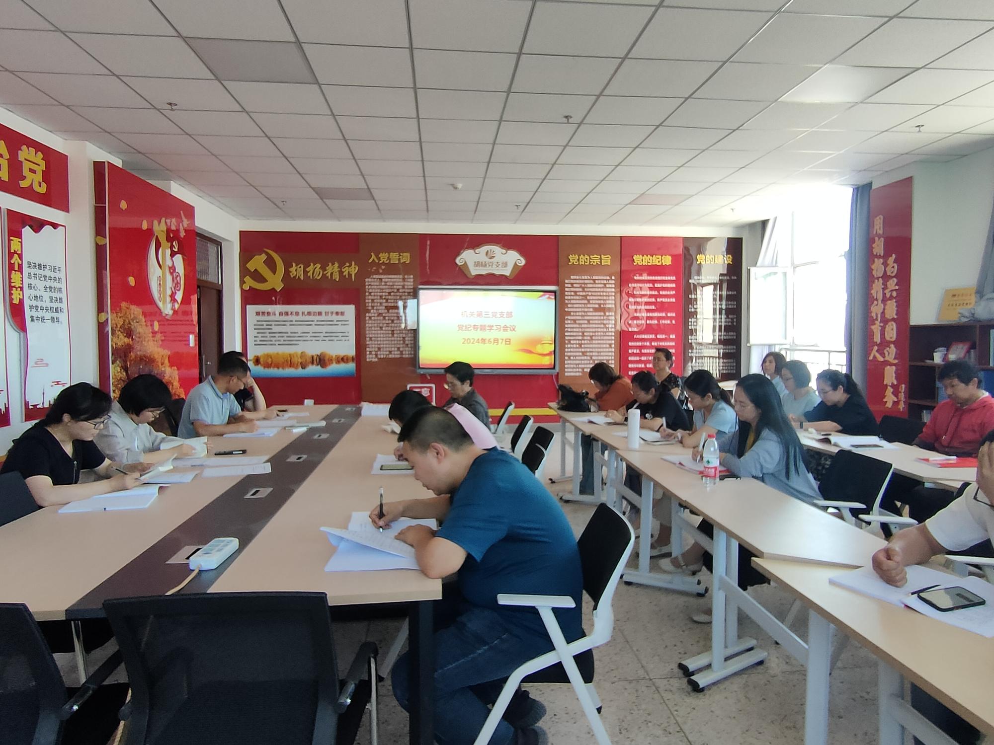 6月7日下午,学院机关第三党支部召开全体党员大会暨党纪学习专题党课。会议由支部书记谢之鑫主持,支委班子成员、全体党员参加本次会议。