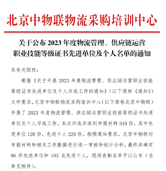 与此同时,中物联物流采购培训中心公布的2023年度物流管理“1+X”证书制度试点先进单位及个人名单中,我院荣获“2023年度模范考核站点”称号,徐丽、程文科和王小艳老师分别荣获“优秀辅导教师”“优秀考务管理员”和“优秀考评员”荣誉称号。