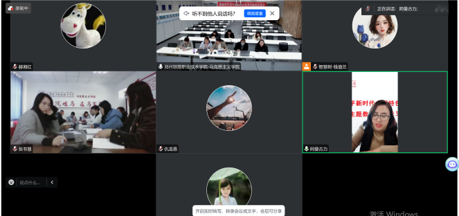 会上,新疆交通职业技术学院张书慧老师和郑州铁路职业技术学院武强老师首先分别介绍参与研讨交流的领导与老师,并在云端亲切问候致意。此次交流研讨会涵盖四项议题,分别为“说课:第五章 中国特色社会主义理论体系的形成与发展”“实践教学模式探索(包括实践案例分享)”“互动讨论:围绕‘如何设计有效且富有吸引力的实践课程环节’”以及“如何利用在线平台有效促进课程实践活动的开展”。