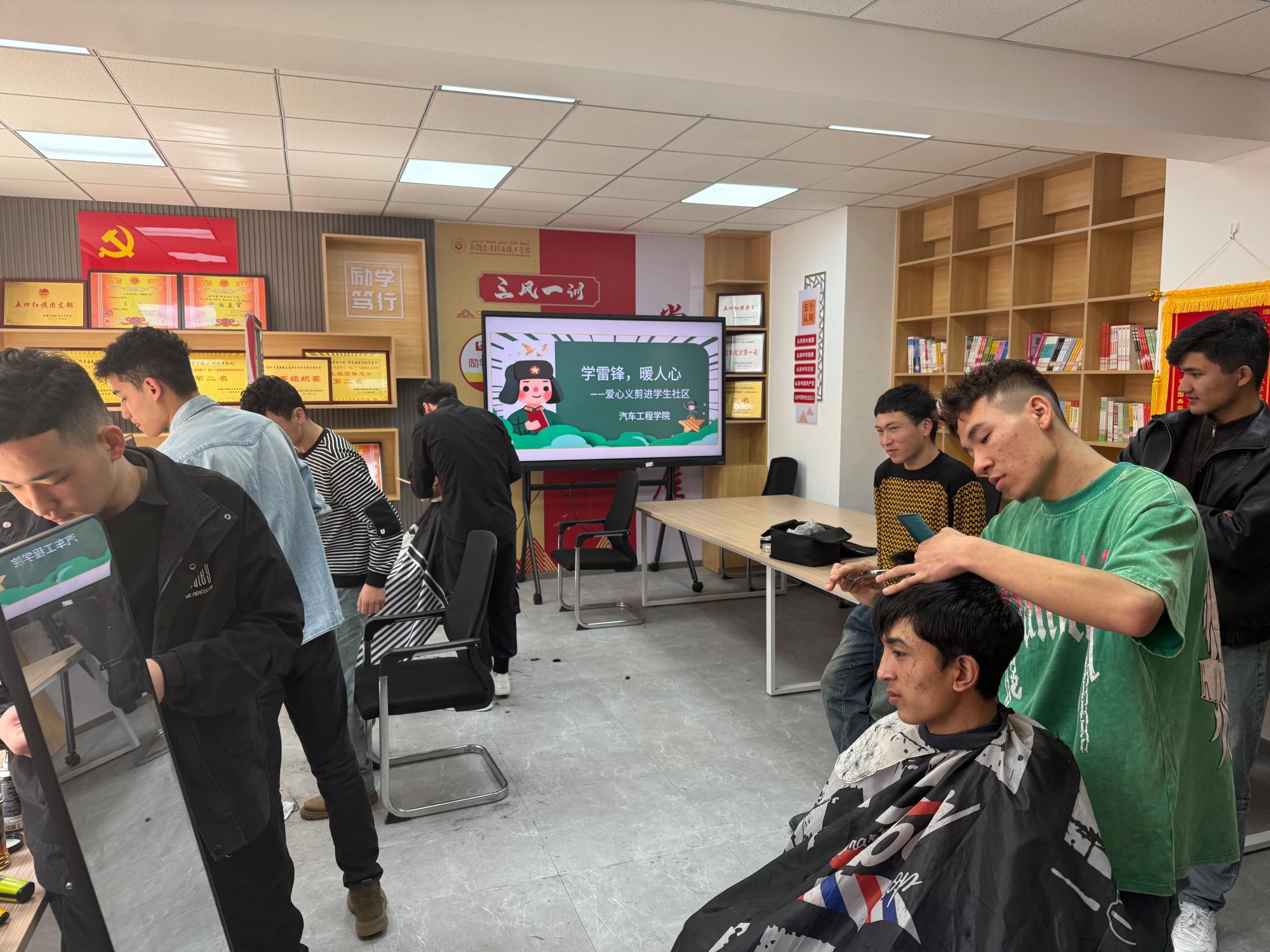 活动当天,志愿者们在“一站式”的红色书屋搭起了临时理发点,4位“Tony老师”准备好理发工具,热情迎接前来理发的师生。活动现场井然有序,志愿者们耐心询问每位的需求,并根据他们的喜好精心设计发型。无论是简单的修剪,还是时尚的发型设计,志愿者们都认真对待,力求让每一位同学满意。
