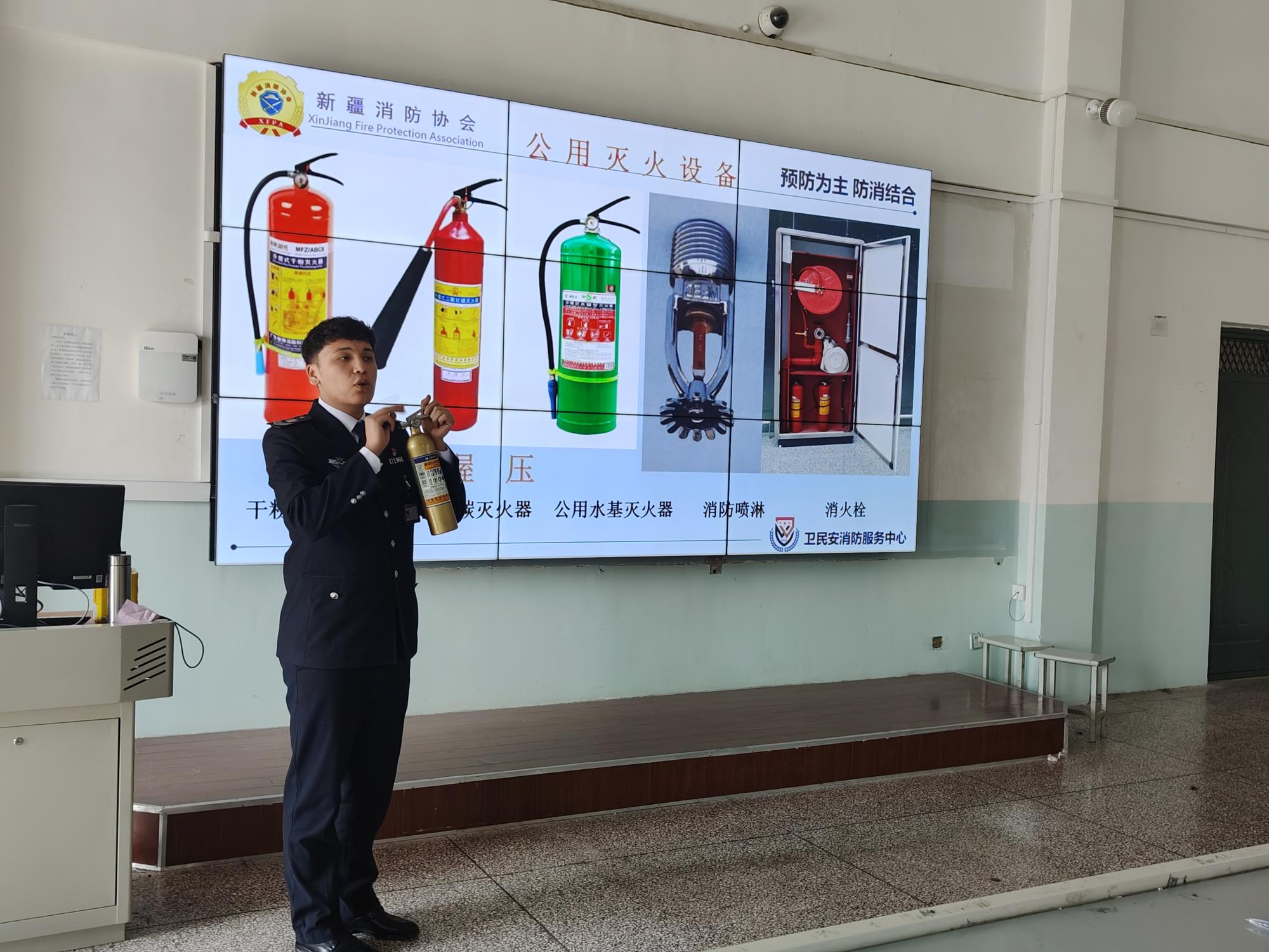 培训会上,依合提达尔·艾力江教官结合校园特点,通过真实案例,详细讲解了火灾的成因、危害及预防措施,并现场演示了灭火器、消火栓等消防器材的正确使用方法。师生们认真聆听、仔细记录,积极提问互动,现场学习氛围浓厚。