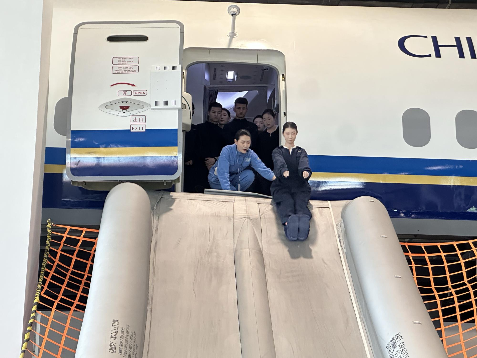 在南航新疆分公司乘务教员的带领下,同学们沉浸式体验了“安全为基、服务为魂”的培养体系。在水上训练厅学习了穿戴救生衣、了解救生筏、掌握水上求生知识与取暖姿势。在陆地训练厅,研习787静态舱的双通道滑梯、737动态舱沉浸式模拟强气流颠簸等,系统学习了“抱紧防撞”应急防护技能及滑梯撤离全流程操作。在灭火实训环节,学生在教员帮助下正确佩戴呼吸保护装置,沿疏散标线定位火源,30秒内完成“火势”压制。在应急医疗救护室,教员指导学生进行CPR等急救训练,为今后守护旅客生命健康打下基础。除此之外,学生还学习了致礼问候、化妆仪态、茶叶冲泡技艺等内容,深刻理解乘务员多技能培训对提升服务品质的意义。