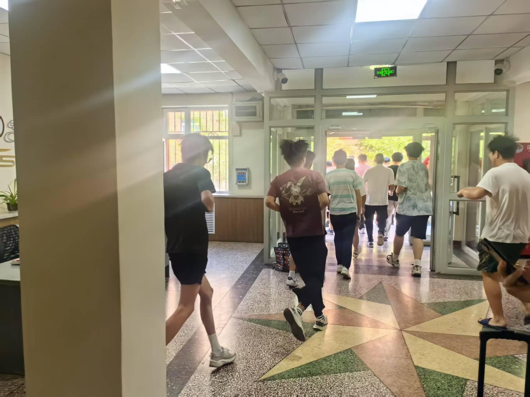 15时整,刺耳的消防警报声骤然响彻公寓楼,演练正式启动。全体师生迅速进入应急状态:学生用湿毛巾捂住口鼻,弯腰低姿沿墙面行进;教师化身“引导员”,在各楼层楼梯口提示“不要拥挤”“注意脚下”;安全警戒组同步封锁公寓周边通道,保障疏散路线畅通。仅2分钟,所有人员便有序撤离至公寓前广场集合点。随后,各班级负责人逐一清点人数并向指挥组报告,确认无人员滞留。