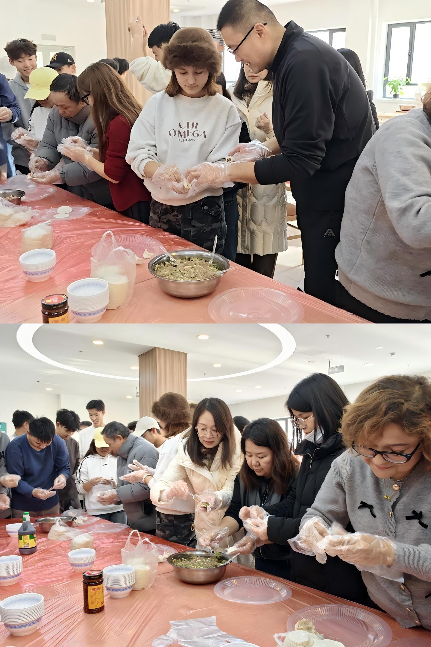 活动伊始,学生管理办公室早已精心准备好了饺子馅、饺子皮以及各种工具。师生们踊跃参与,热情高涨。大家围在一起,分工协作,场面热闹非凡。师生们化身“厨艺达人”,一边熟练地包着饺子,一边亲切交谈,分享着各自家乡的冬至习俗和包饺子的心得,现场欢声笑语不断,洋溢着温馨和谐的节日氛围。
