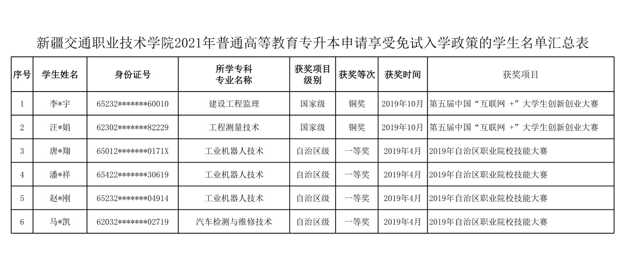 新疆交通职业技术学院2021年普通高等教育专升本申请享受免试入学及享受加分录取政策学生名单公示