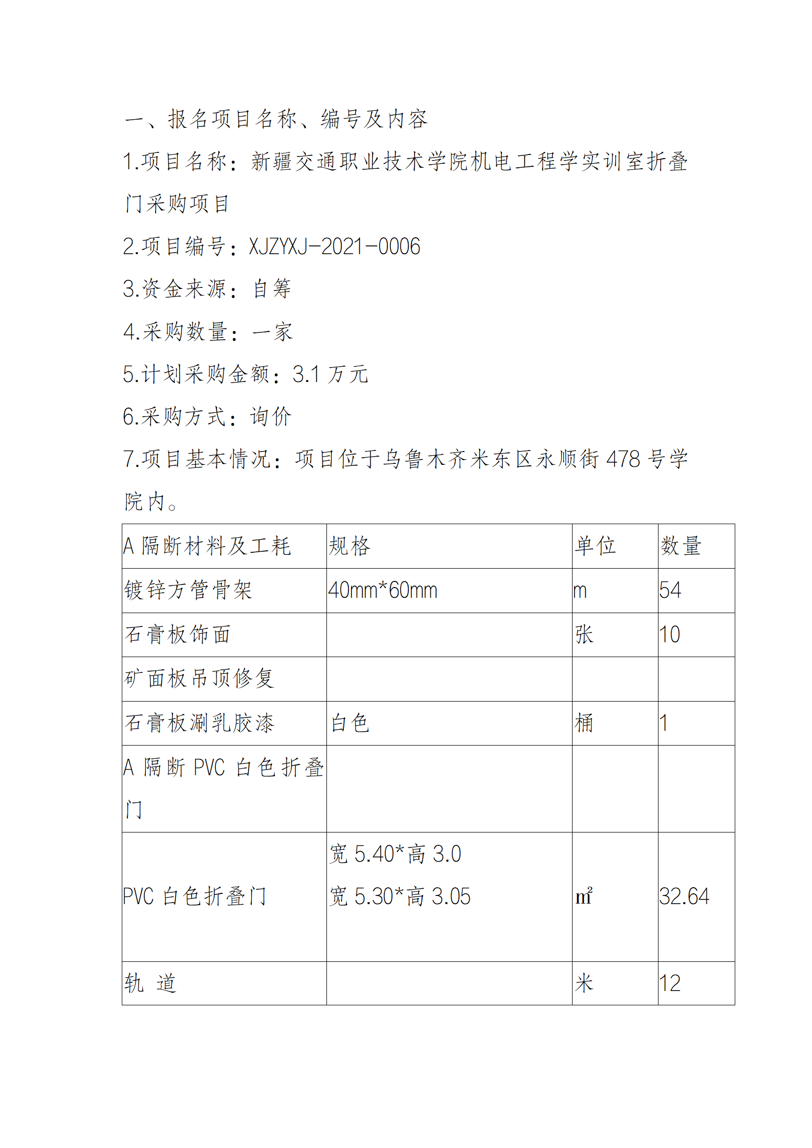 新疆交通职业技术学院机电工程学实训室折叠门采购项目